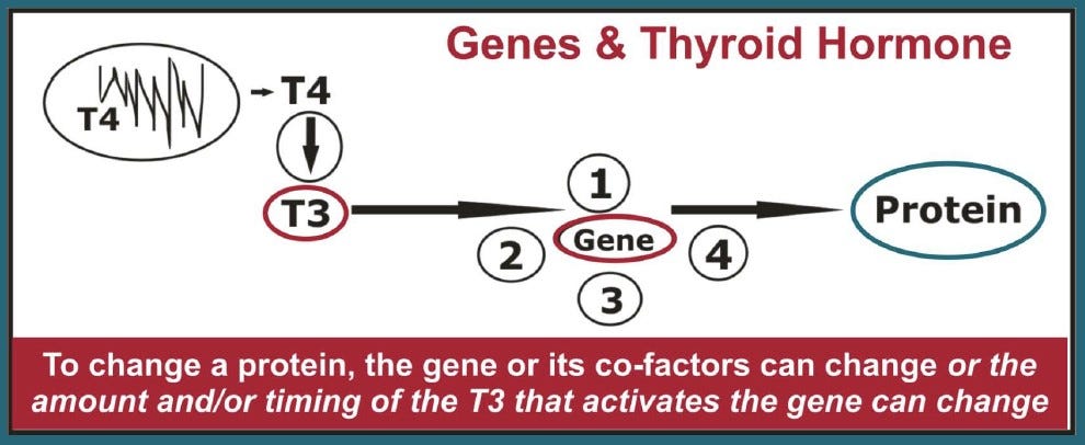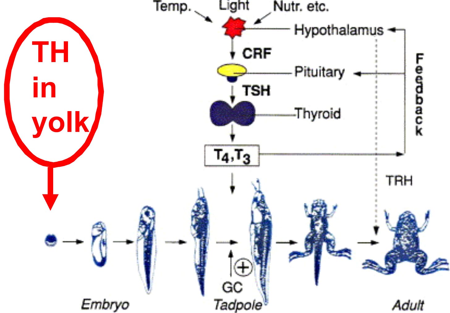 The rhythmic release of hormones — especially thyroid hormones — are known to exert profound effects on the initiation of genetically-controlled life history traits, such as stages of metamorphosis in amphibians, smoltification in salmon, the age of sexual maturity, and the time of year that animals mate or enter hibernation.4