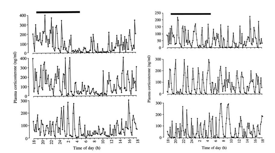 The two breeds of rats used in this study had significant differences in mean profiles of hormone production (as well as slight individual variations within breeds) in addition to significant differences in behavioural responses to a controllable stress (so-called white noise). The success of these experiments in demonstrating the existence of fine-scale patterns of corticosterone production and in correlating these profiles to stress responses suggests that a similar method might be suitable for testing the thyroid rhythm hypothesis.