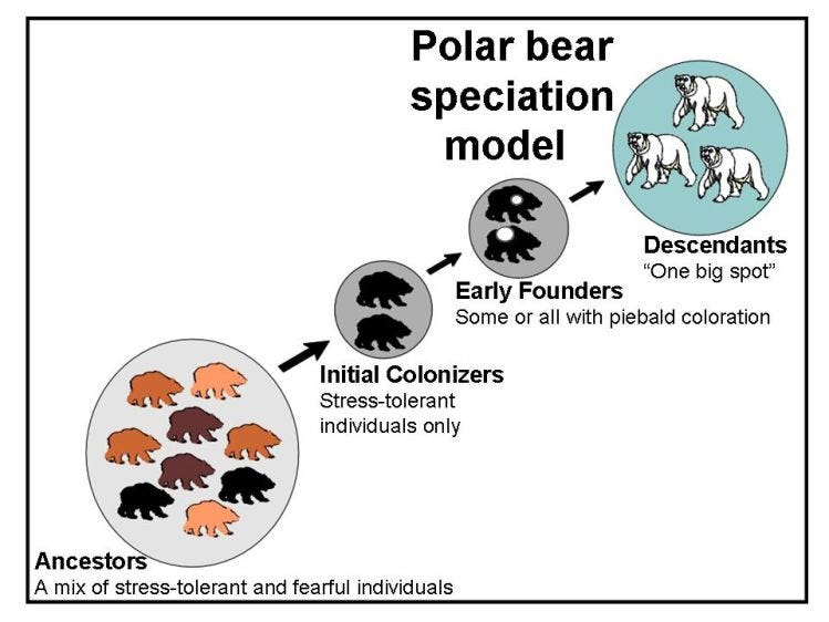 The model predicts that non-random subdivision of populations often occurs during speciation, isolating particular subsets of individuals with similar thyroid rhythms within founder populations. Developmental repercussion of reduced thyroid rhythm diversity in the founding group is assumed to be responsible for generating the particular growth and development changes seen in descendant taxa.
